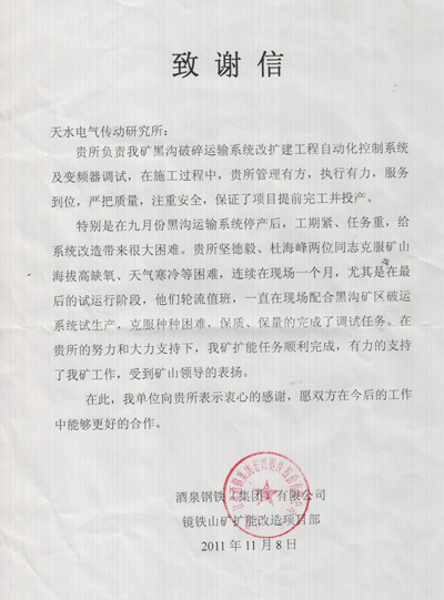 11月8日,酒泉鋼鐵(集團(tuán))鏡鐵山項(xiàng)目部發(fā)來(lái)《感謝信》向長(zhǎng)城電工天水電氣傳動(dòng)研究所有限責(zé)任公司表達(dá)謝意,對(duì)天傳所公司的精誠(chéng)合作和公司員工的辛勤付出表示由衷地感謝。
