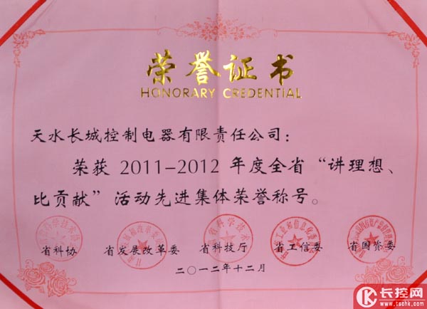 11月23日,長城電工天水長城控制電器有限責任公司在2011-2012年度全國“講理想、比貢獻”活動中獲先進集體榮譽稱號,受到中國科協、國家發(fā)展改革委、科技部、國務院國資委聯合表彰。