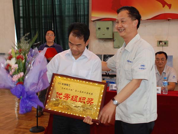 (長城電工黨委書記楊春山為獲獎代表隊頒獎)