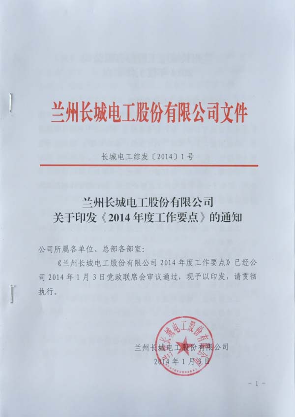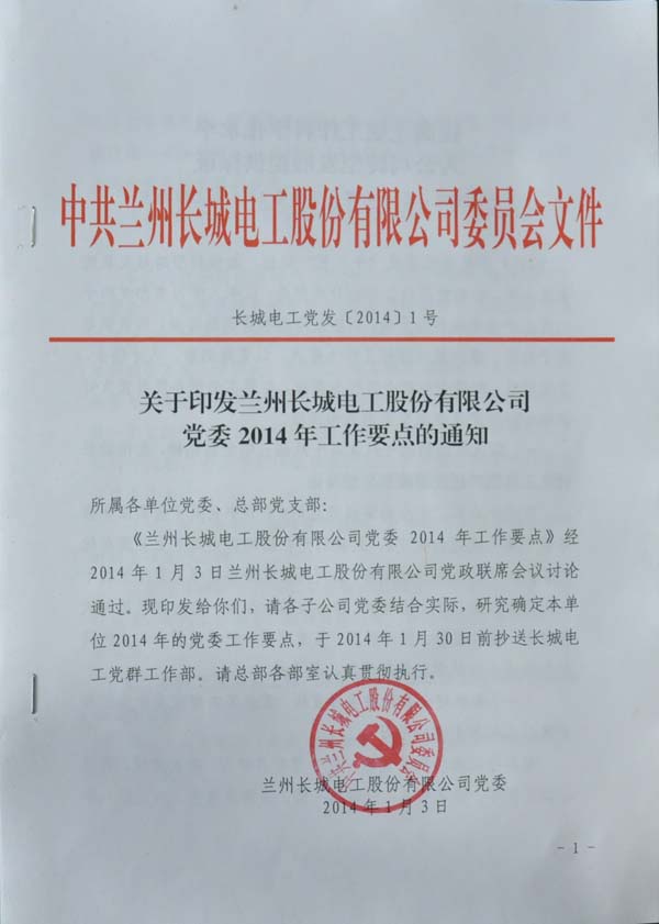 1月3日,公司黨委和行政分別下發(fā)《關(guān)于印發(fā)蘭州長(zhǎng)城電工股份有限公司黨委2014年工作要點(diǎn)的通知》(長(zhǎng)城電工黨發(fā)〔2014〕1號(hào))和《蘭州長(zhǎng)城電工股份有限公司關(guān)于印發(fā)<2014年度工作要點(diǎn)>的通知》(長(zhǎng)城電工綜發(fā)〔2014〕1號(hào)),對(duì)公司2014年度黨委和行政工作進(jìn)行了安排部署。