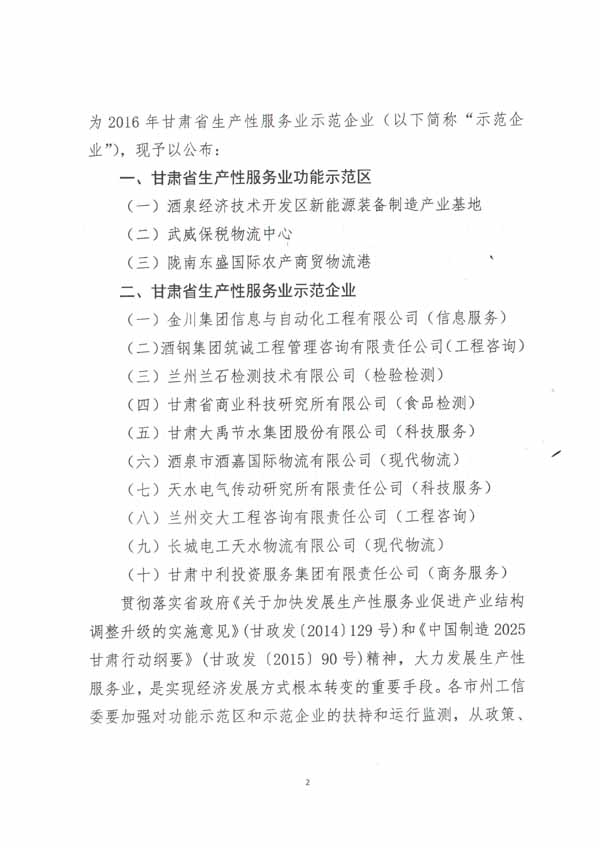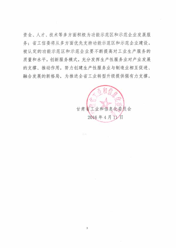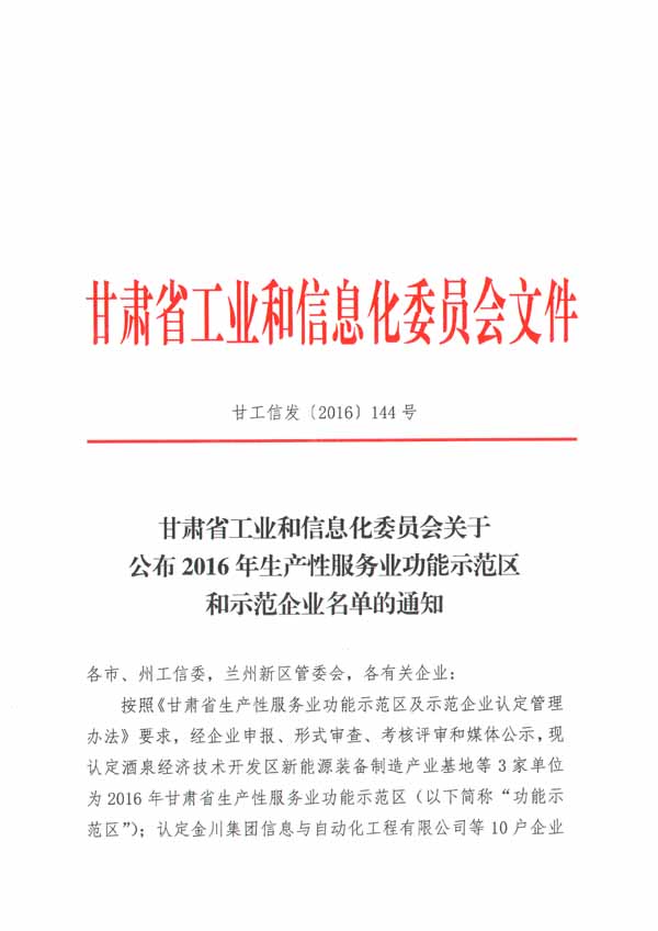 經(jīng)過(guò)企業(yè)主觀材料申報(bào),甘肅省工業(yè)和信息化委員會(huì)形式審查、考核評(píng)審和媒體公示,公司被甘肅省工業(yè)和信息化委員會(huì)認(rèn)定為2016年甘肅省生產(chǎn)性服務(wù)業(yè)示范企業(yè)。