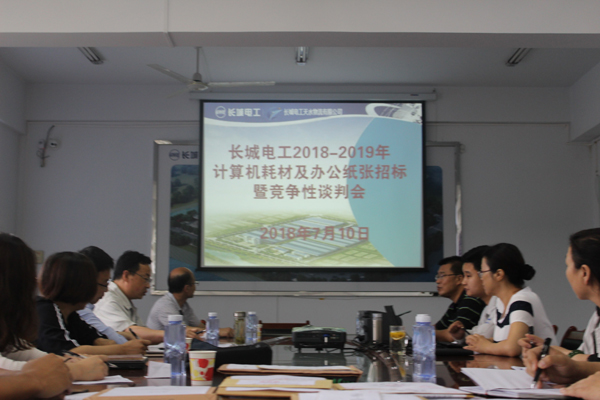 2018年7月10日,長(zhǎng)城電工辦公用紙張及計(jì)算機(jī)耗材招標(biāo)暨競(jìng)爭(zhēng)性談判會(huì)在物流公司召開(kāi)。本次招標(biāo)按長(zhǎng)城電工招標(biāo)專家?guī)旃芾磙k法,抽取了5位評(píng)標(biāo)專家, 3位物資使用公司代表參加,8家投標(biāo)方代表及工作人員共計(jì)20余人參加會(huì)議。